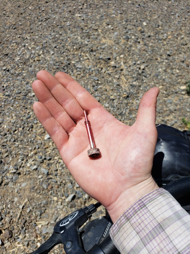 Only three miles after the turn, I heard a hissing noise, and my seat started to bounce. I hollered at Sean and stopped, noticing the massive thing I had hit. Not a nail, not a screw, maybe a piece of a valve? It was still stuck in my tire and had created a second puncture from the inside of the sidewall. My tires are setup tubeless, so we stopped, removed the object, and hoped the sealant would do its job. Though it seemed hopeful, any slight pressure to either puncture just made sealant spray everywhere. We decided to put in the backup tube and head back to the highway that way if we needed help at least people would be around.
