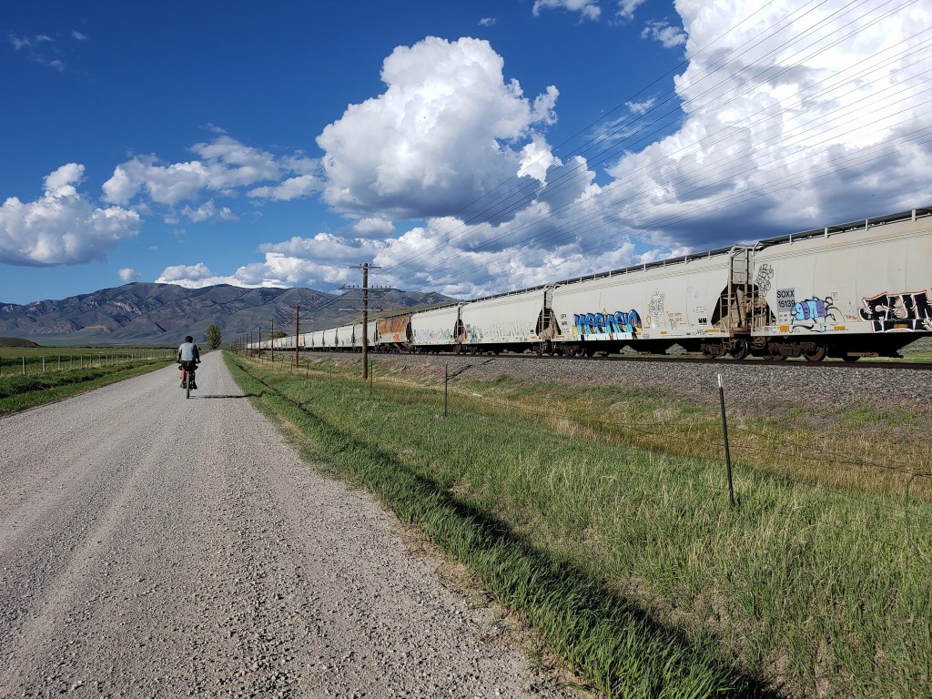 In the afternoon, we exited the mountains and rode on a mix of dirt and paved backroads through massive fields. The ride was mostly flat as we entered Blackfoot stoked for a shower and town food.
