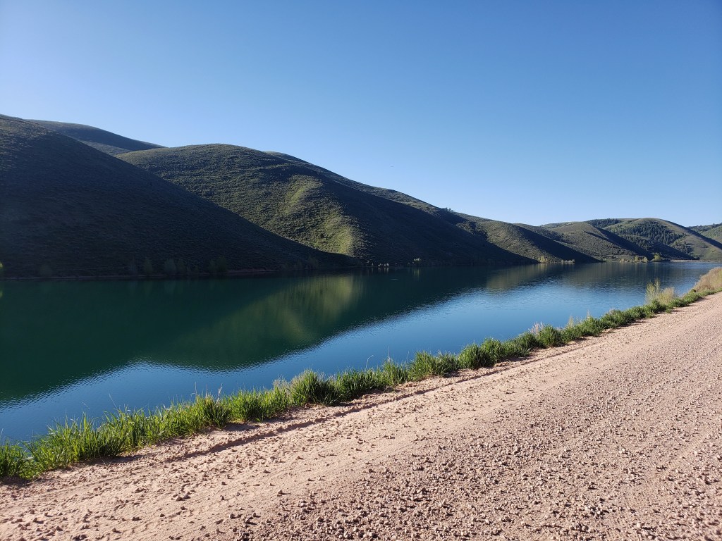 Our morning began with a brief climb that took us to a main highway. We glided about 3 miles downhill and took a turn back onto a dirt road by a reservoir. It was Memorial Day and lots of families were still out RV camping and playing with their ATVs, side by sides, and guns. We cycled on climbing gradually under a clear blue sky. Our max elevation for the day was around 8000 ft, and we were pleased to not encounter any snow.