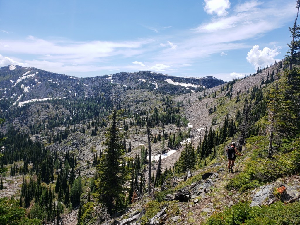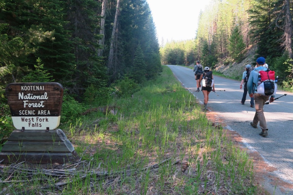 Overnight, a little rain fell from the sky. It was mostly dry in the morning, but ominous clouds filled the sky. We started a big descent that lead down into the valley with rain intermittently falling in us. I spotted another black bear as we came down the mountain, again running away from us quickly. We crossed the Moyie River which brought us to our last big climb before town. We started a steep 3500 ft climb up and over a mountain switchback after switchback, a seemingly endless ascent. The sky had cleared by this point, leaving us drenched with sweat instead of rain. Finally, we started heading downhill and just had 1 more obstacle between us and town – a mile of bushwhacking connecting two trails. We spent about 40 minutes climbing over and around down trees, creating a path through the woods. Our final stretch was dirt road walk to a highway where we waited about an hour on the sleepy road for a ride to Bonners Ferry. With an aggressive start to a challenging trail, we all were excited to take our first day off and catch up on sleep.