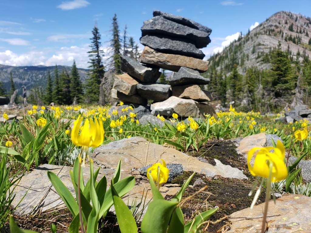 Whew, this was another tough section of the PNT. We had our first significant distance of road walk which is easy walking but somewhat boring and tough on the feet. Each day we faced steep long climbs while the temps hovered around 90° without any wind. The climbs tended to coincide with burn areas so much of the effort was done without any shade. However, we were rewarded with an amazing display of wildflowers and a nice section of views from a ridgeline. During a couple stretches, we faced 10-12 mile water carries which weighed down our packs and expended more effort. After 10 aggressive first days on trail, we deemed a zero day in Bonners Ferry necessary.