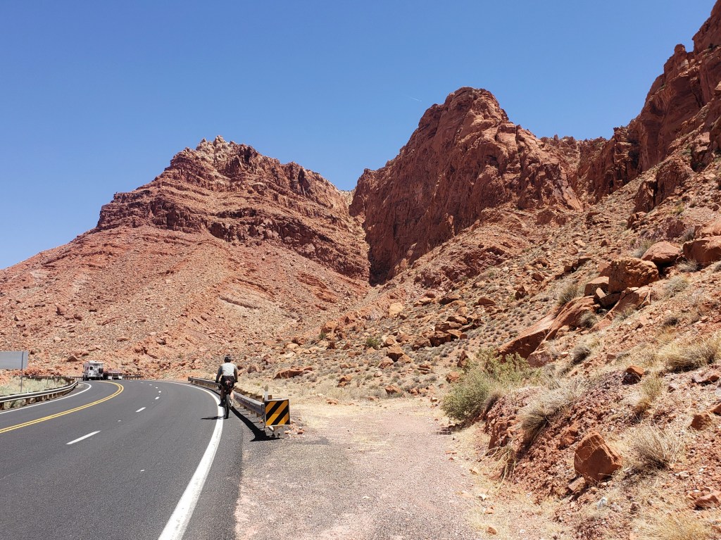 We started our morning extra early hoping to get ahead of the traffic that was heading north towards Page and Lake Powell. It was a hot day with two major climbs matched with two seemingly endless descents. We spent our day pedaling hard and listening to music as car after car whizzed by us on the busy highway. While we wished we were out on the dirt, the scenery from the highway did not disappoint. We enjoyed the cruise by massive red rock monoliths and canyon walls that stretched for dozens of miles. We somehow finished 80 miles of riding and got to Page by 2:00 and headed to a hotel room for the night.