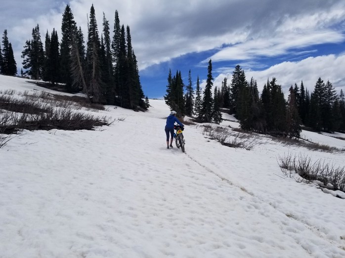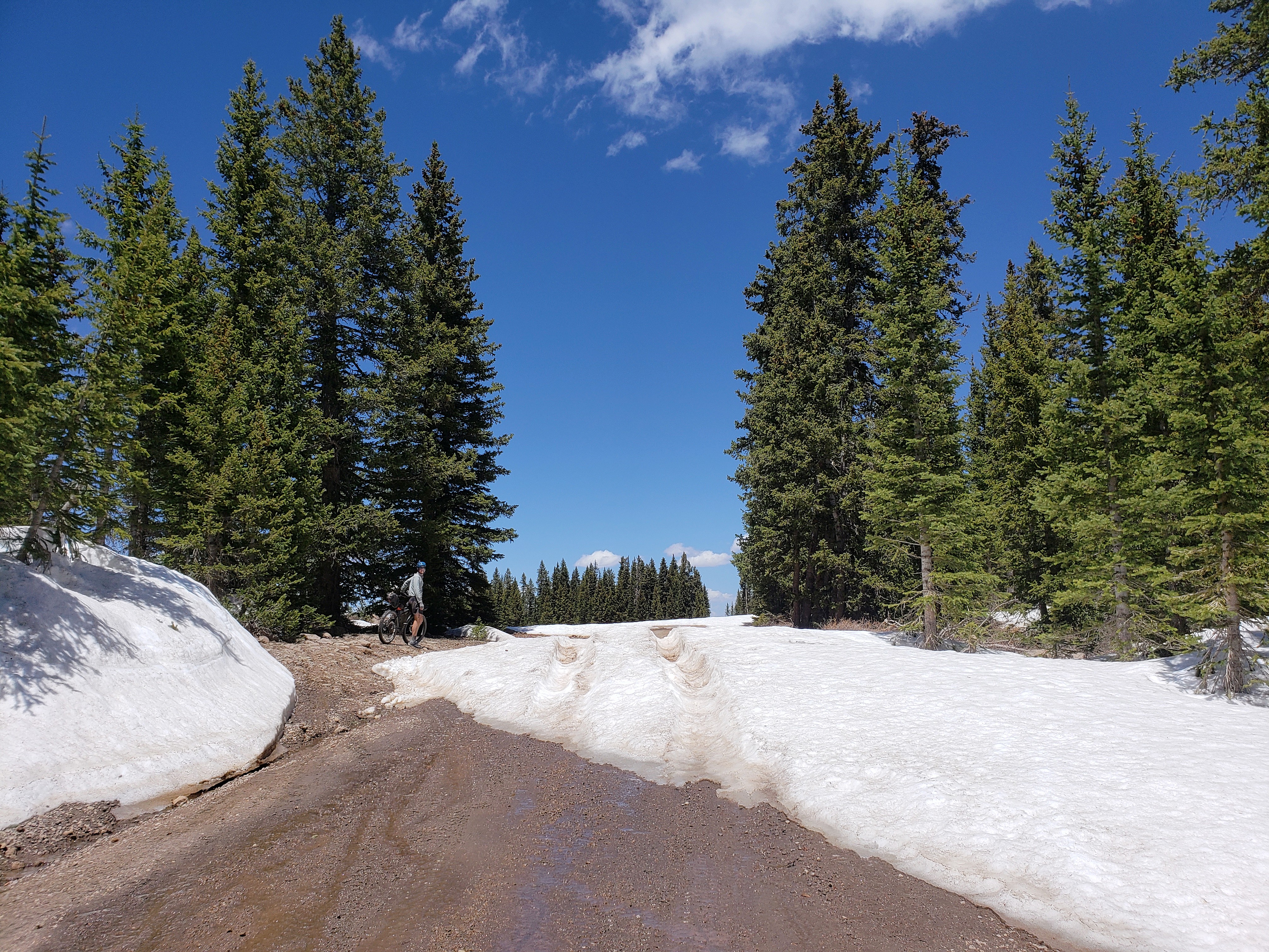 Our next hurdle was a stretch of snow as far as we could see. We were about 500 ft and a mile or so shy of the high point for the day. Beyond that point, however, we wouldn’t come down below 9,000 ft for 50 or so miles. We started questioning what we should do as clouds loomed and snow stretched as far as we could see. We decided to attempt to carry on, literally carrying our bikes over large sections of snow. When we came to uncovered ground, we attempted to ride, but eventually the mud clogged and locked our tires. We were left without much option – we had to turn back.