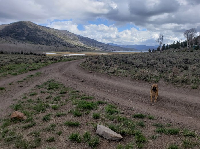 In the morning, big gray clouds filled the sky, the wind remained intermittent, and the little dog was still roaming around our tent. We packed up the bikes, and as if on cue, the little dog began running by our bikes when we took off. We returned to the highway for a couple miles while the dumb dumb little dog chased cars and wandered in the middle of the road. As we hit the dirt, I found a number for a semi-local animal shelter to see if they had any advice. I explained the situation to the lovely volunteer, but she didn’t really have any solutions. She told us the dog was a cattle dog, may or may not be claimed and regularly fed, and thanked us for trying to help it. Basically, she said don’t feed it and don’t worry about it. Once we were off pavement, I was able to relax a little more and enjoy the ride. The next 15 miles we spent riding dirt roads to Fish Lake while the little dog (who I named Gerry) trotted along keeping an impressive pace.