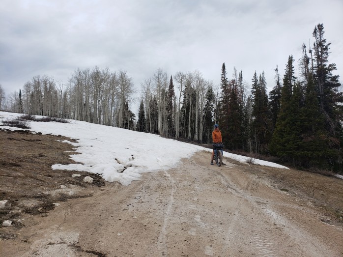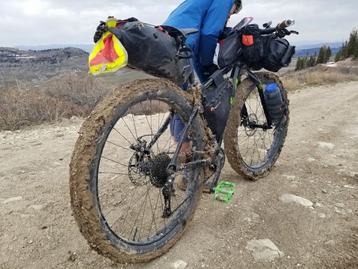 We started the climb just outside of Salina heading up into Fish Lake National Forest on gravel roads under clear sunny skies. The climb was slow and steady with the steepest portion between miles 15 – 20 where we had to push our bikes on occasional short segments. The landscape changed from sage scrub, to pine trees, and then miles of Aspen trees. We took our lunch break around 1, and the sky was almost completely overcast. As soon as we stopped riding, the cold settled in, and we did our best to keep our lunch short and keep moving. Eventually, we got to and above treeline and came to our first patch of snow for the day. We crossed the section and continued up. At this point, the WWR was on a road called Skyline Drive that essentially just rides the ridge for over 50 miles between 9,000 and 10,700 ft. As we continued on, we came to more and more patches of snow. In between the snow, the clear patches were completely saturated, and the clay mud began accumulating on our tires. Mud, gravel, and little sticks started piling up on the tires growing quickly layer after layer. It seemed we were discovering what Utah’s “impassible mud” was all about.