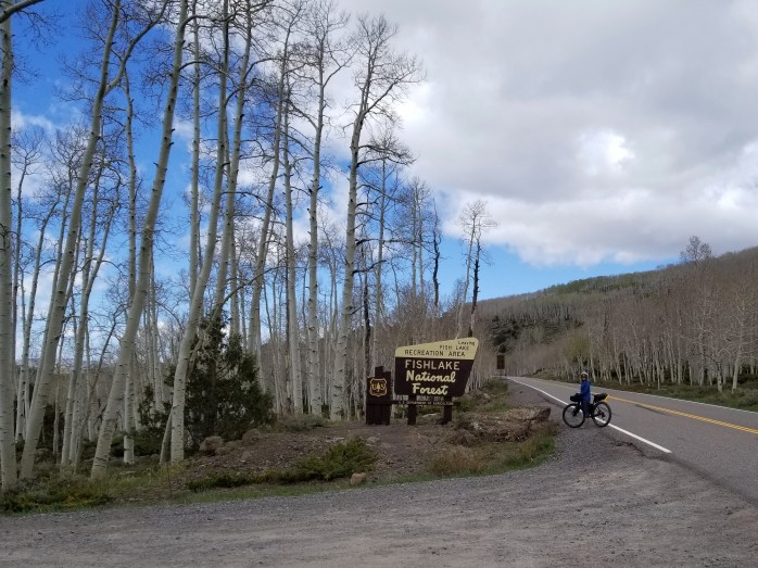 When we arrived at Fish Lake, a couple was out photographing the beautiful aspen grove we were riding through. We said our hellos, and the gentleman informed us we were standing in Pando, the world’s largest known living organism. Pando is an aspen clone consisting of over 40,000 individual trees covering 106 acres. We had heard of the grove, but we didn’t know we would be riding to it. It was quite a lovely surprise. The couple noticed Gerry, and we explained the situation. Thankfully, they were willing to hold onto the dog while we pedaled away on pavement for fear the dog would once again try to start a fight with traffic.