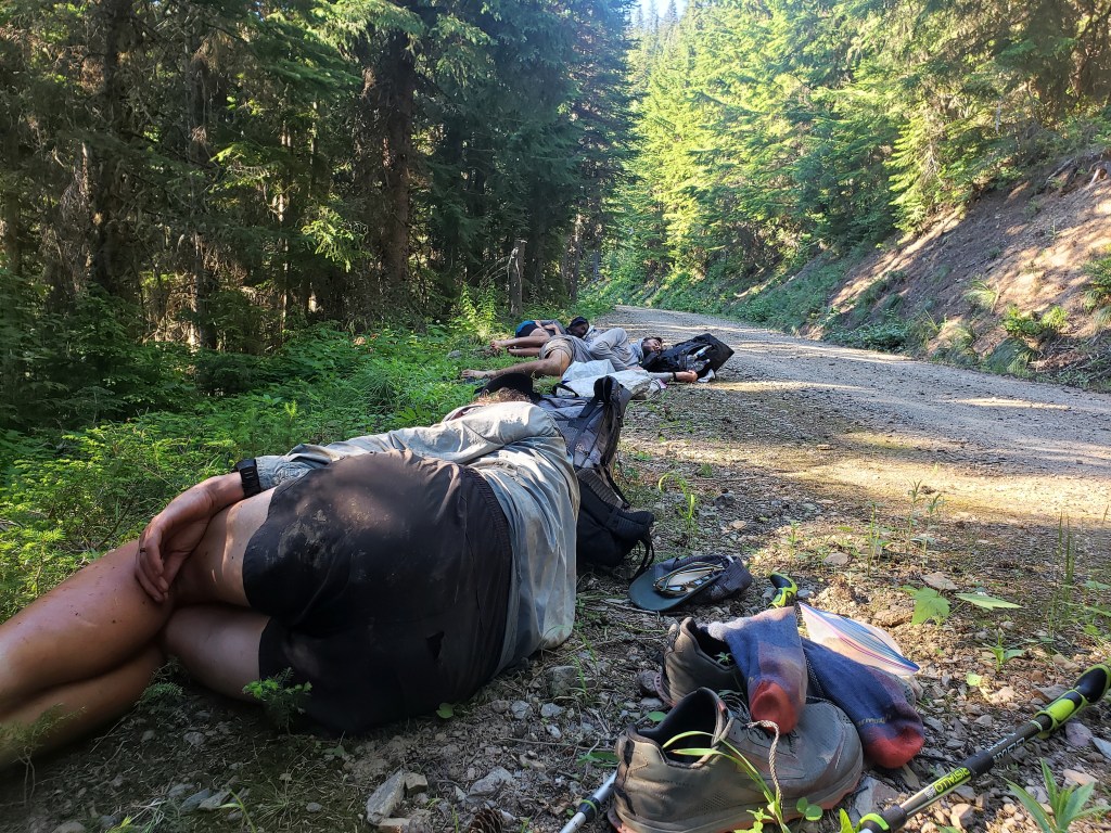 After a much needed zero day in Bonners Ferry, we started trying to hitch a ride about 15 miles back to trail at 5:30 am. About an hour later, we found a ride for all six of us with Ashlyn and I pretzeled into the trunk. By 7:00, we started our 10 mile mostly flat road walk through colorful alfalfa and canola fields. We had learned of an unprecedented and historic heatwave on our day off and felt the temperature rising as we approached single track. Around 10:30, it was time to start one of our biggest climbs we have encountered thus far on the PNT. Our endless climb, of course, coincided with a burn area providing zero shade for us as we melted our way up the trail. Oh, and there were no listed water sources on the way up, so we carried 3-4 liters each and did our best to ration. Sweat poured and temperatures rose as we gained the ridge. Exhausted, we took our lunch in the smallest sliver of shade we could find.