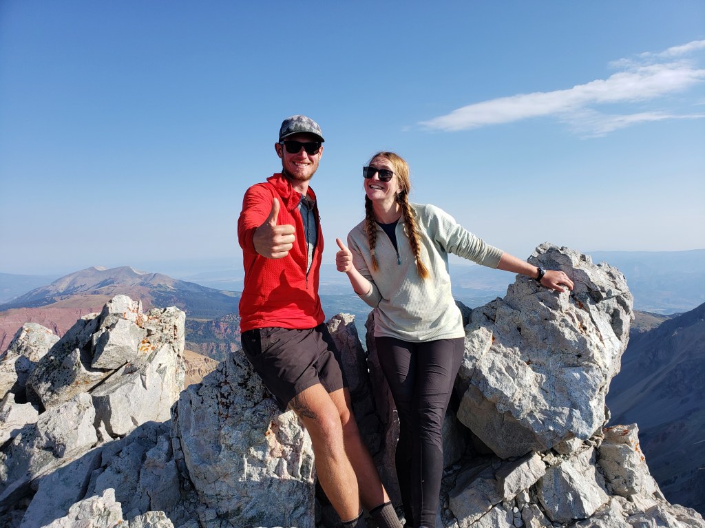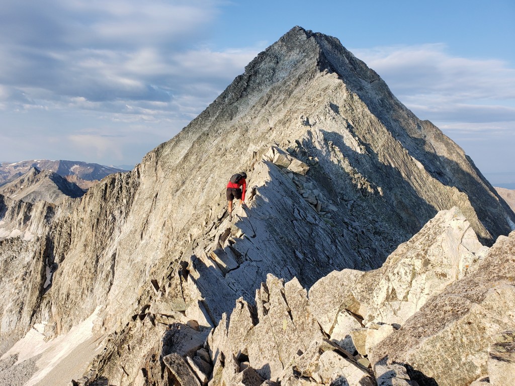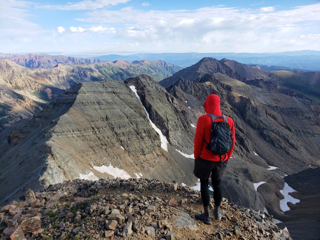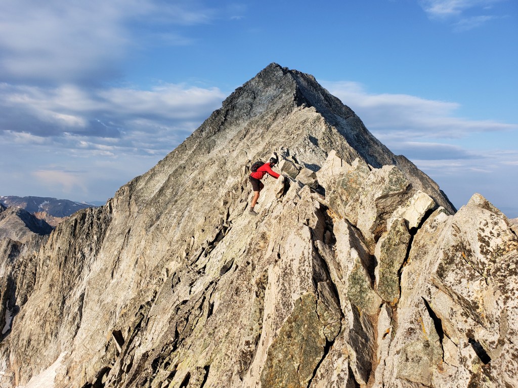 I searched the knife edge for foot and hand holds grateful the rock was solid, yet couldn’t seem to find the courage to walk. Instead, I decided to inch worm my way across in the most literal way you can imagine. The ridge was below my chest, my legs straddling the mountain, and I used my arms to pull my way across. It took me way longer to cross than Sean with many deep breaths, positive affirmations, and reminding myself not to look down. I was elated to exit the knife edge with my feet safely below me though we still had about 500 ft of Class 3 and 4 climbing to the summit. We ended up catching the other 2 climbers ahead of us and continued route finding together as a group of four. The remaining route proved not terribly difficult as long as I didn’t get too caught up in looking down. We all reached the summit together ecstatic to have safely climbed Colorado’s most difficult 14er.