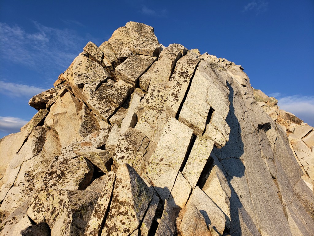 We smashed some snacks and then began the tedious boulder hop back to the saddle. It took some careful footing, but it wasn’t too long before we reached the cliffs. Considering we had skirted the cliffs in the dark, we really had no recollection of the route we had traversed. Slowly and carefully we crossed a couple gullies of loose rocks and gravel then, finally, returned to the saddle. We had completed all of the challenging climbing aspects leaving just the hiking portion back to the trailhead.