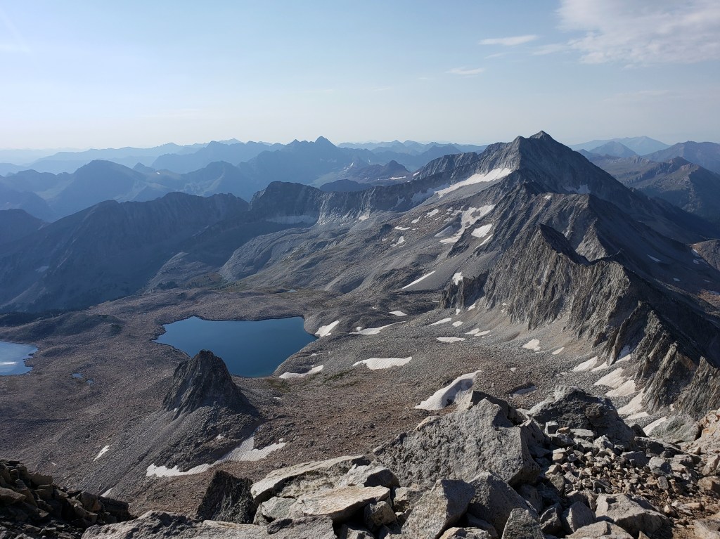 The final push was a rock scramble with some exposure and Class 3 maneuvers. Compared to the last couple summits, however, the climb seemed simple. Or perhaps my skills and comfort level are adjusting to the circumstances. Regardless, it took about 35 minutes on the ridge to the summit where we collapsed for about 25 minutes. Trailhead to summit took about 8 hours.