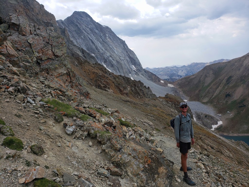 We began from our camp at Crater Lake at 5:20 walking for about 40 minutes in the dark before sunrise. As we began our long uphill ascent, the trail was solely comprised of loose gravel and dirt making for a slow go. Just before 9, we reached the ridge where 14ers.com warns that the difficult portion of the hike begins within the final 1000 ft to the summit.