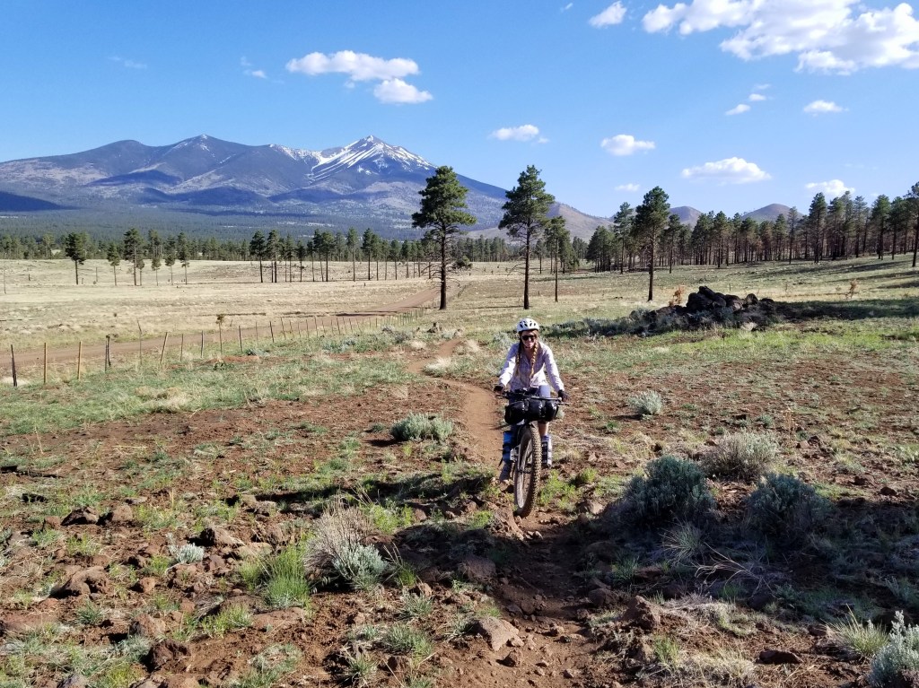 We left the hotel room and headed towards Humphrey’s Peak that towers over Flagstaff. Climbing began immediately as we made our way around the stunning mountain. As we climbed the east side, we entered an area that had burn damage and encountered our first section of blown down trees, lifting our bikes over and dipping under the tree carcasses discarded like pick-up sticks.